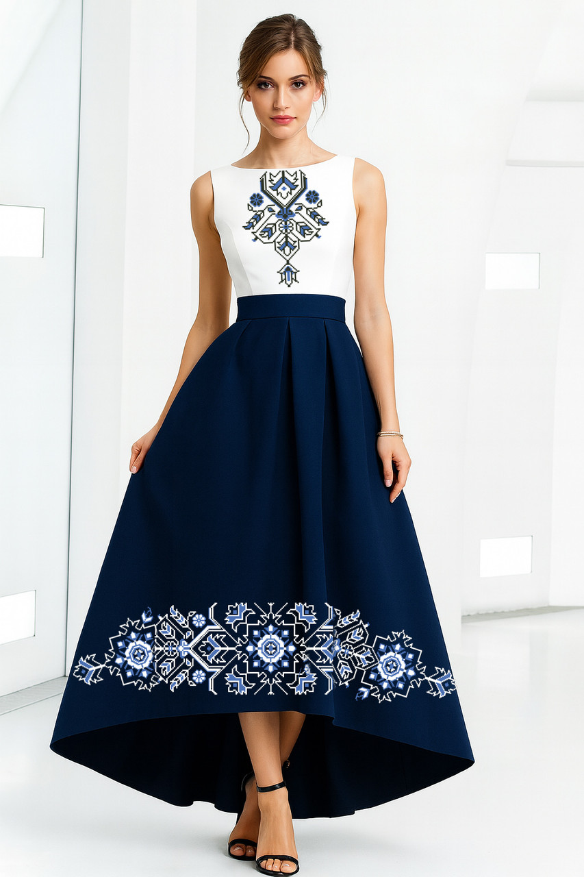 Заготовка для вишивки бісером або нитками жіночої сукні, з нанесеною повно колірною схемою.